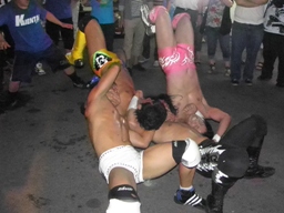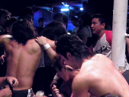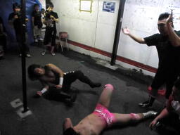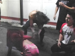 安部と佐藤は客席、リングサイドで乱闘。石井と佐々木は外に出て行く(左写真)。