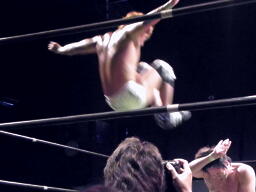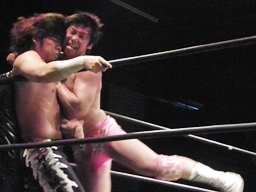 佐藤619(左写真)、コーナーに上ってダイビングフットスタンプ、カウント2。15分経過。