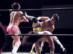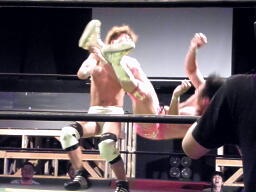 佐藤にはミサイルキック(左写真)、カウント2。安部ロープに飛ぶ、佐藤ドロップキック、佐々木にタッチ。
