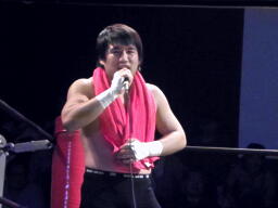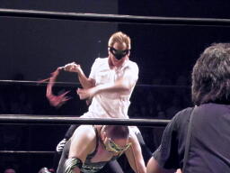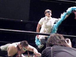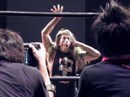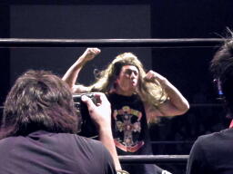 「佐藤光留じゃなきゃいい」ということでマッスルにも出場した金本ヒカルで入場(右写真)。「これで文句ないやろ。でもな、さすがの俺でも1vs2はキツい。強力なタッグパートナー呼ぶから。先に言うとくが、あんまり期待して欲しくないんやけど。ほな、入ってもらおか。」