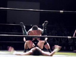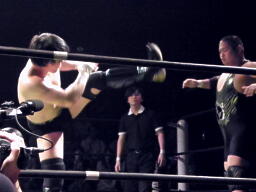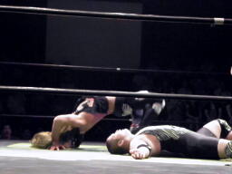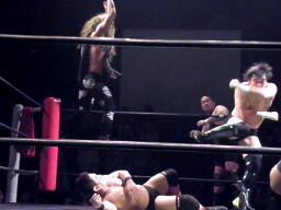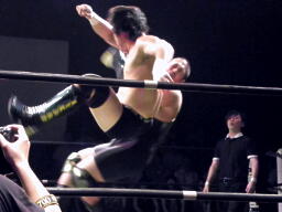 そしてスウィート・チン・ミュージック(右写真)。入江は高木にタッチ。高木ドラゴンリングインからドロップキック、マイケルズはヒカルにタッチ。