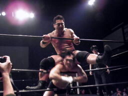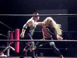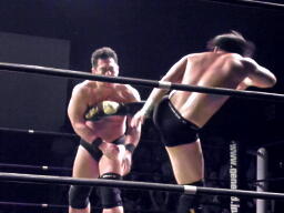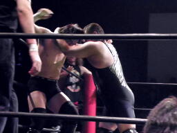 マイケルズバックハンドチョップ(左写真)、高木も返す。高木ヘッドロック、マイケルズロープに振る、高木ショルダーブロック。高木ロープに飛ぶ、マイケルズドロップキック、ヒカルにタッチ。