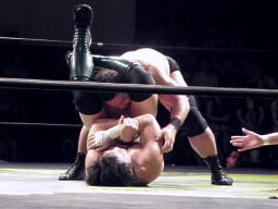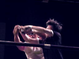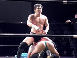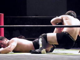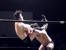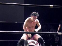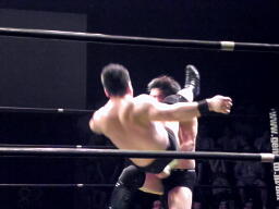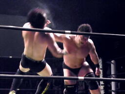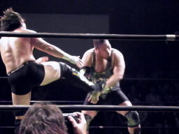 ロックアップ、入江押しこむ(右写真)、ブレーク。再度ロックアップ、今度はヒカルが押しこむ、張り手の打ち合い、エルボーの打ち合いに。ヒカルミドルキック連打からハイキック、ネックロックに捕えてマイケルズにタッチ、入江も高木にタッチ。