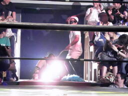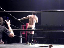 マイケルズついに股間をクロッチ(左写真)。マイケルズは花道側に転落、入江と乱闘しながら控室方向へ。