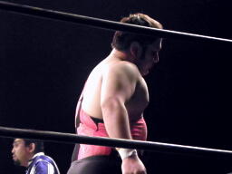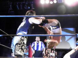 ここからは交代で2人ずつがリングに戻り闘う展開。坂井がアントンにショルダークロー(左写真)。