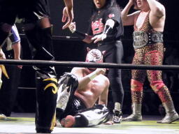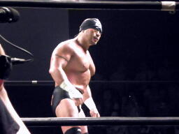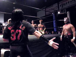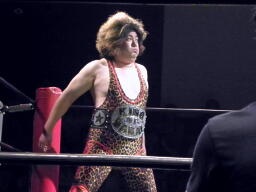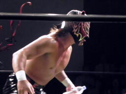 IMGPヘビー級王者、大阪プロレス選手権者&ブレイブゲート王者の三冠王者・タイガースマスク入場(左写真)。
