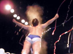 いったいどうなるんだか全く見当がつかない5試合同時シングルマッチ。最初にアントンが入場(右写真)。