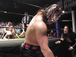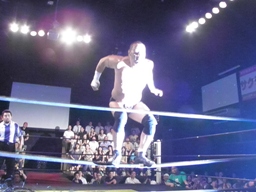 トペに行くかと見せてロープに飛び乗るとサルト・モルタル(左写真)。妙技ごちそう様でした。