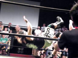 東郷ロープに飛ぶ、ウラノカウンターのドロップキック(右写真)。