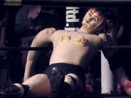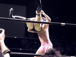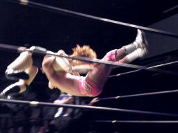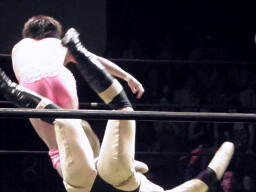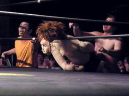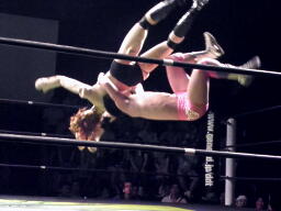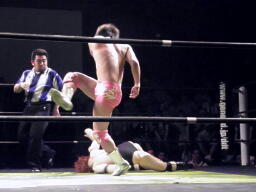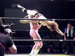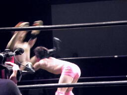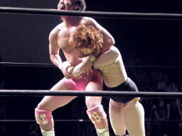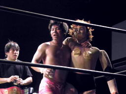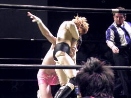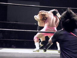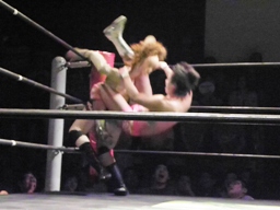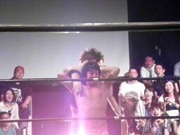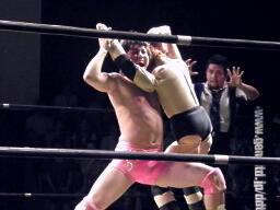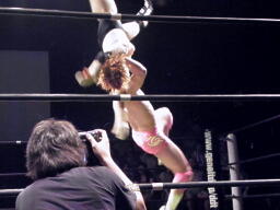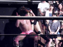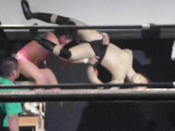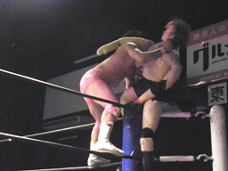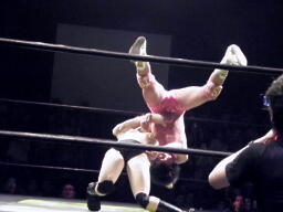 石井はひな壇の上からパワーボムで落とそうとする、ヨシヒコウラカン・ラナに切り返す(右写真)。ダブルノックダウン。場外カウントが進む、両者同体で戻る。石井ハーフネルソンスープレックス、カウント2。10分経過。