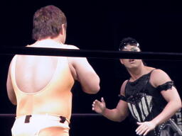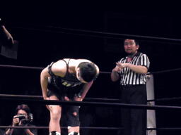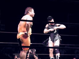 二度目の入場。ニセ田村は四方に深々と礼(右写真)。またニセタニーが飛び込み「それは田村欣子じゃなくて田村潔司だろ!」と突っ込む。「田村様は水を噴くんだ」と教えられニセ田村は水を噴くがコーナーではないので田村様っぽくはない。しかも「オイオイ」言ってる。それは大仁田だ。