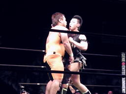 ニセタニーコーナーに振る、ニセ田村切り返すと「さくらえみ75kg!」と叫んでニセタニーにクロスボディ(左写真)。そんなこと言うと恨みを買うんじゃないか?