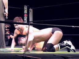 ニセタニーは背後に回ってスクールボーイ(左写真)、カウント2。