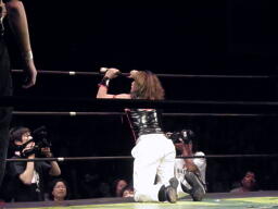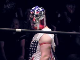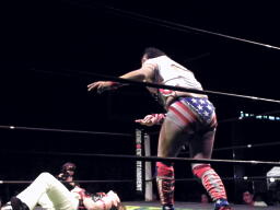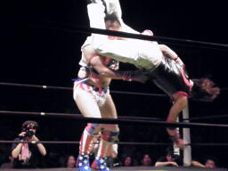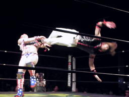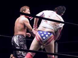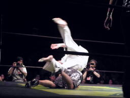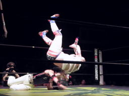 島本リリースしてバックドロップ、ばってんは場外エスケープ。場外でなぜかパトリオットに変身するばってん。ネタを披露するが観客の反応が薄い(左写真)。