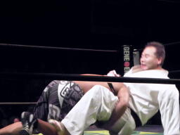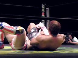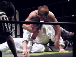 島本ビクトル投げ(右写真)、ロープブレーク。5分経過。