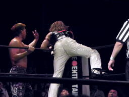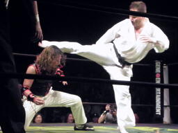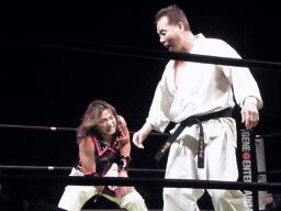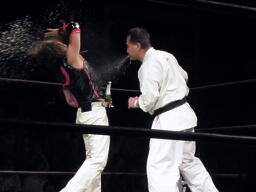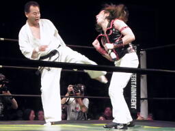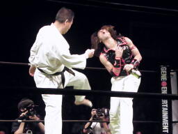 小笠原中段蹴りで逆襲(右写真)。小笠原ついでに木曽レフェリーにも正拳、木曽レフェリーダウン。