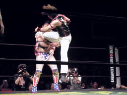 島本ヒザ蹴り(左写真)、ばってんはなす術なし。