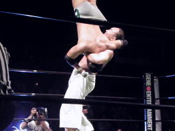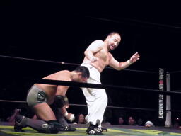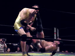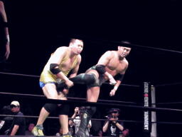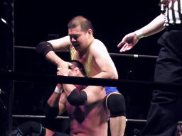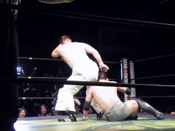 澤シャイニングウィザード狙い、マンモスキャッチしてノド輪落とし狙う(左写真)、澤は脇固めに。マンモス切り返す、澤がロープ。マンモスが澤からエスケープ取った!マンモスは越中にタッチ。