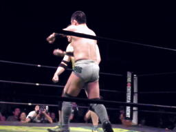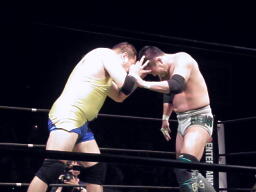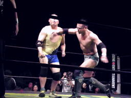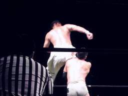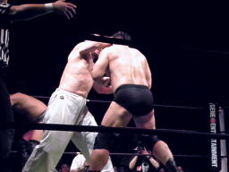 エルボーの打ち合い、張り手の打ち合い(右写真)、マンモスが打ち勝ってカバー、カウント2。越中にタッチ。