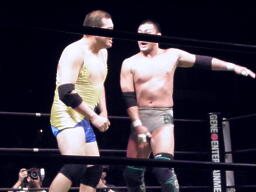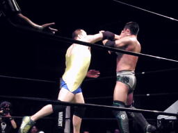 マンモスと越中と言えば5月のこの試合だが、気に入られたとは思えない内容。どういう縁だ?井上リングアナはこの試合が急遽KO-Dタッグ選手権になった、とコール。