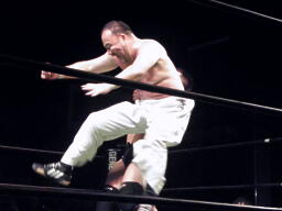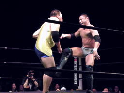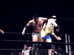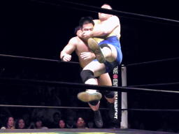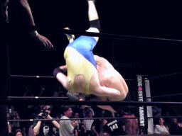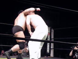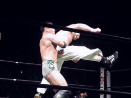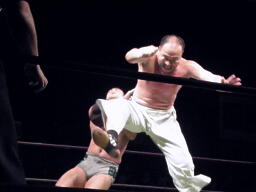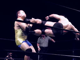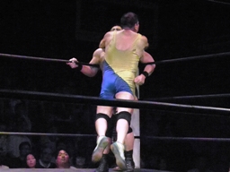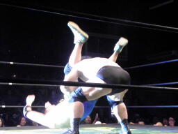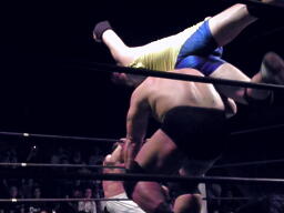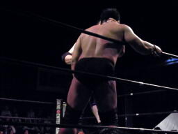 高木はマンモスを肩車に捕らえてシットダウンひまわりボムに、しかしマンモスの回転が不十分で危険な落ち方のサンダーファイヤーパワーボムに(左写真)。高木カバー、カウント3。