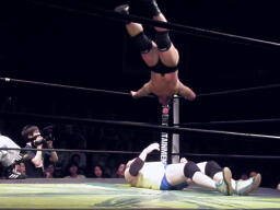 コーナーに上ってダイビングヒップアタック(右写真)、カバーは高木がカット。澤は高木にタッチ。