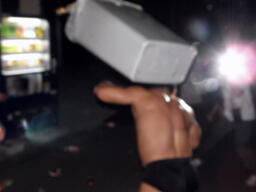 越中は自販機前でゴミ箱を高木の頭にぶつける(左写真)。澤がどこからか自転車を持ってきて越中に突っ込むが越中かわし高木を轢く。越中は澤を連れてリングに戻る。