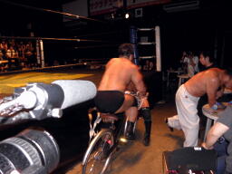 高木は自転車を会場内に持って帰り乗り回す(右写真)。
