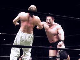 高木が救出に入るが越中はエルボーで撃退(左写真)。越中はマンモスを呼びこんでダブルのヘッドバット。