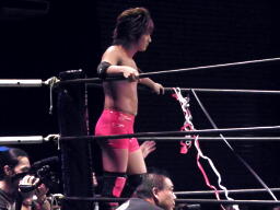 入江カメラマンは応急処置(たまたまいたグレース浅野さんが処置したらしい)のためその場を離れる。坂井土下座(右写真)。万一観客に当たってたらもっと悲惨な事態になってたかも。