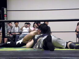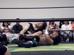 アームロックに(右写真)。佐々木ロープに振ってまたホイップ、アームロック。ウラノもホイップ返すが佐々木はさらに切り返す。