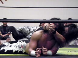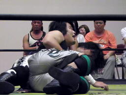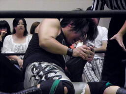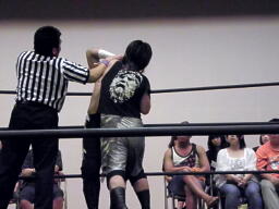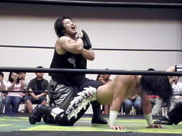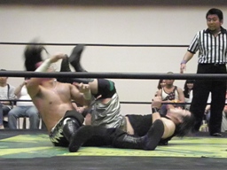 佐々木が腕をひねる(右写真)、ウラノ切り返してネックロックからカバー、カウントは1。立ち上がってロープブレーク。