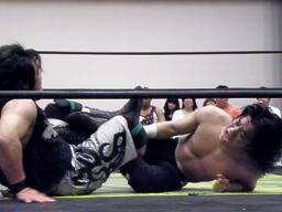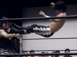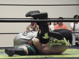 ウラノ低空ドロップキック(左写真)、カバー、カウント2。ウラノ足4の字に、佐々木は決まってしまう前にロープエスケープ。