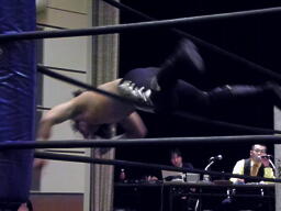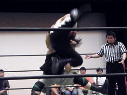 佐々木コーナーに上る。ウラノも上って雪崩式ブレーンバスター狙うが佐々木はブロック、突き落としてダイビングエルボードロップ(左写真)、カウント2。