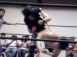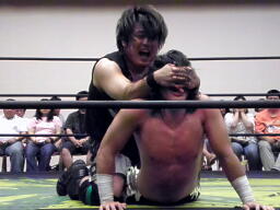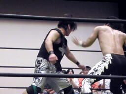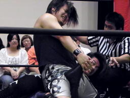 ウラノ首固め、佐々木切り返す(左写真)、カウント2。佐々木ガットショットからDDT、ウラノ場外エスケープ。