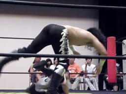 ウラノがリングに戻る、佐々木はコーナーに上ってクロスボディ(右写真)、カウント2。