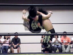 佐々木ブリッジで返して逆さ押さえ込み、ウラノ立ち上がってドロップキック、佐々木かわして逆にドロップキック、ウラノかわす、佐々木延髄蹴り(左写真)。