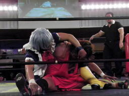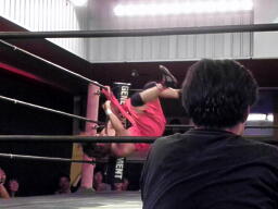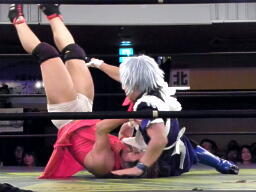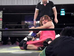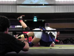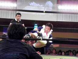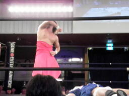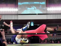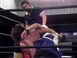 安部とらドラスープレックス狙う、内田体を沈めてエビ固め、カウント2。さらにラ・マヒストラル(右写真)、カウント2。