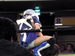 松井レフェリー「このままやるの?」返事はないが試合開始。安部のスカートの下は縞パン(右写真)。