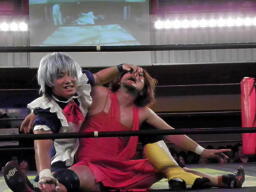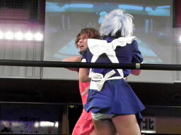 ロープワーク、内田リープフロッグからアームドラッグ(右写真)、安部のウィッグが取れる。