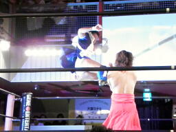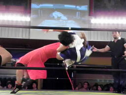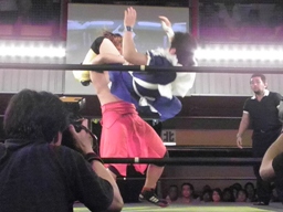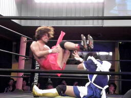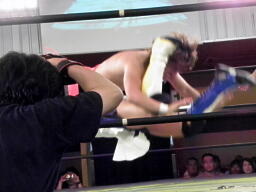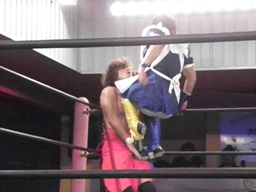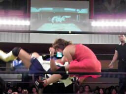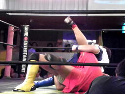 内田ボディスラム、コーナーに上る、安部は立ち上がってロープを蹴る、内田転落(左写真)。