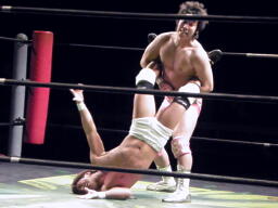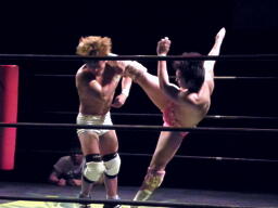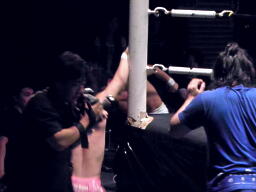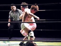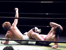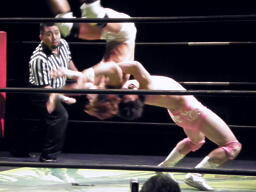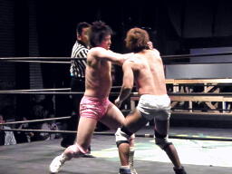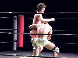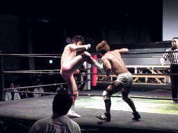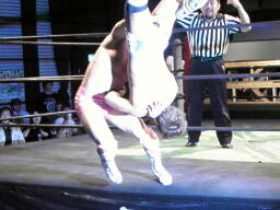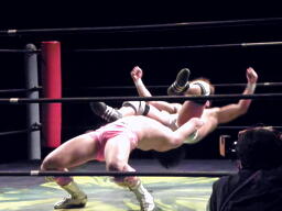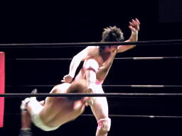石井投げっぱなしジャーマン、佐藤着地(左写真)。佐藤コーナーに振って突っ込む、石井キック、そのまま場外まで蹴り出す。