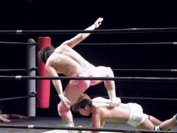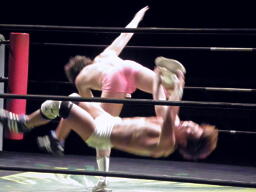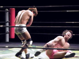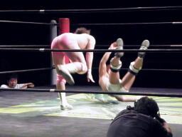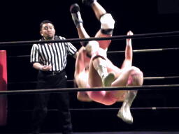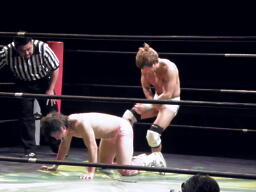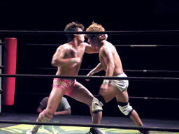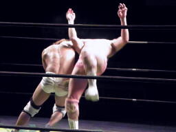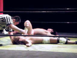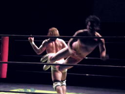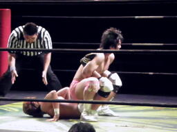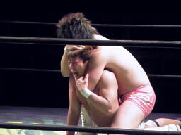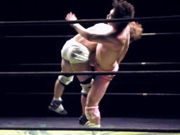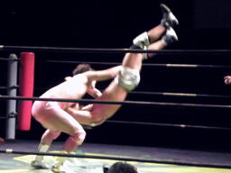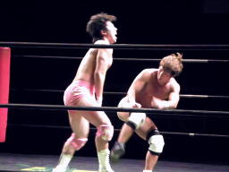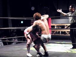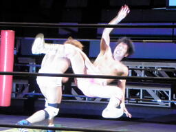 石井ジャーマン(左写真)、カウント2。石井が佐藤をコーナーに上げる、佐藤はヘッドバットで落として頭にミサイルキック、佐藤は四つんばい状態の石井の顔面蹴り上げる。バック取ってジャーマン、石井2で返す。佐藤コーナーに上り石井の顔面にミサイルキック、カウント3。
