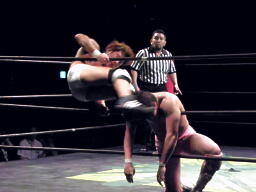 場外カウントが進むが石井は佐藤をリングに戻してカバー、カウント2。さらにボディスラム(左写真)、これもカウント2。