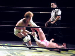 佐藤再度コーナーに上って石井の足へのミサイルキック、そして足4の字固め(右写真)。石井苦しみながらロープに。