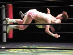 石井ロープに振って再度スリーパー、佐藤はトップロープ越しのバックドロップで石井を場外に落とす(左写真)、石井一回転して足から落ちるがヒザにまたダメージ。