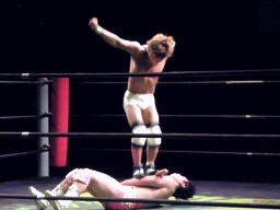 コーナーに上ってダイビングフットスタンプ(右写真)、カウント2。