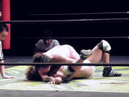 ステップオーバートーホールド(左写真)、石井ロープ。佐藤石井のヒザにキック。5分経過。