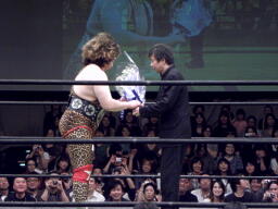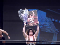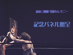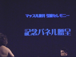 まずはマッスル坂井引退セレモニー、記念パネルの贈呈(右写真)。