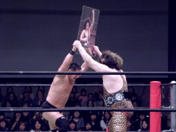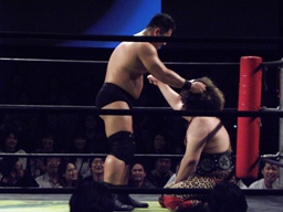 坂井がロープに振るが高木は坂井のアフロをつかんでブロック(左写真)。